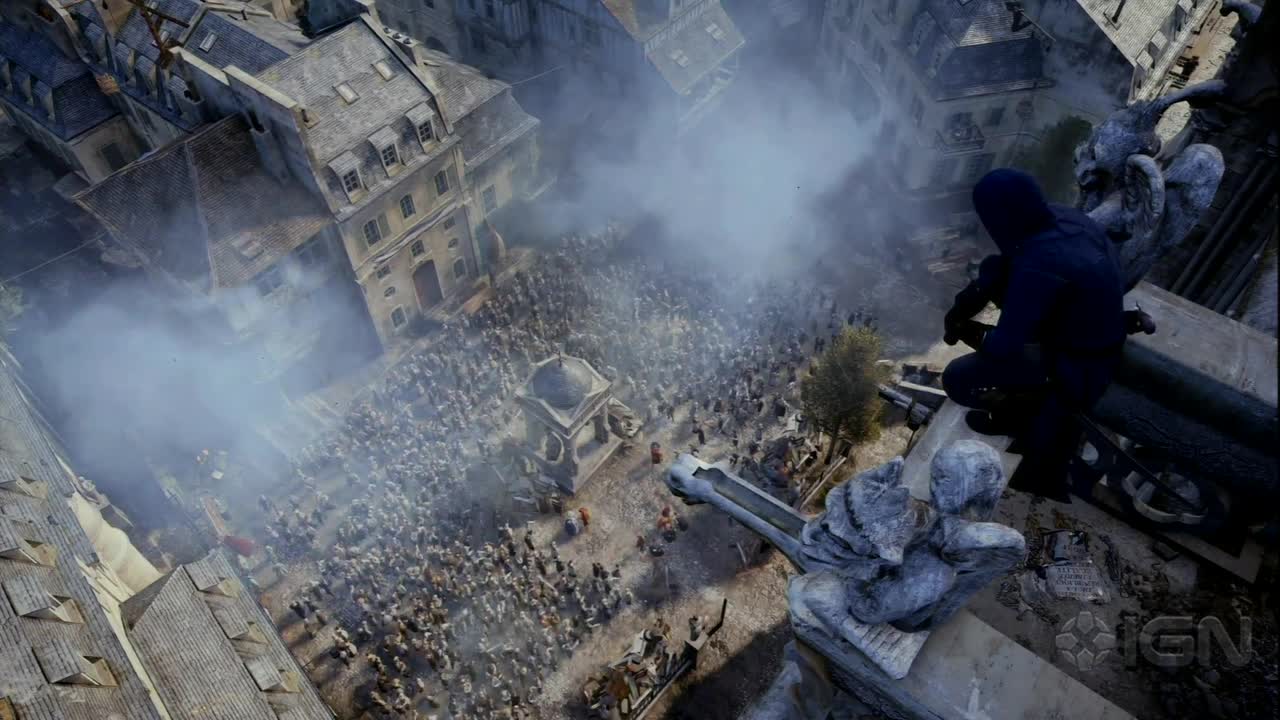 نماهای داخلی ساختمان ها هم از طراحی خوبی برخوردار هستند، هرچند تمرکز بازی بر روی بافت تاریخی و خیابان ها است. جایی که انقلاب در حال وقوع است. ما قبلا در بازی اساسین کرید ۳ حدود ۱۰۰ NPC را به طور همزمان مشاهده کرده بودیم اما با توجه به این تعداد NPC، سازندگان بازی می خواهند دست به ثبت یک رکورد جدید بزنند. گردهمایی ۱۰۰۰ NPC در یک مکان! به علاوه اینکه هوش مصنوعی آنها هم افزایش یافته است. مردم این بار بیشتر از قبل به حرکات شما واکنش نشان خواهند داد. البته با توجه به حجم و بزرگی کار، طبیعی است که باگ ها و ایراداتی هم وجود داشته باشد. NPC هایی که کمی از شما دور هستند رفتارهای ناگهانی و نامنظمی دارند. بعضی از دشمن ها هم وارد درگیری نمی شوند یا اگر شما به یکی از آنها نگاه کنید (بر روی آن قفل کنید) خیلی آماتور گونه خود را در معرض تیغ شما قرار می دهند و به طور مشخص وقتی شما از ارتفاع بلندی به پایین نگاه می کنید یک سایه غیر معمول بر روی صفحه قرار می گیرد. سازندگان بازی غیر از برطرف کردن این موارد، باید خیلی از کار های دیگر را هم انجام دهند. پس انتظار نداشته باشید تمامی این مشکلات در زمان عرضه حل شده باشند.